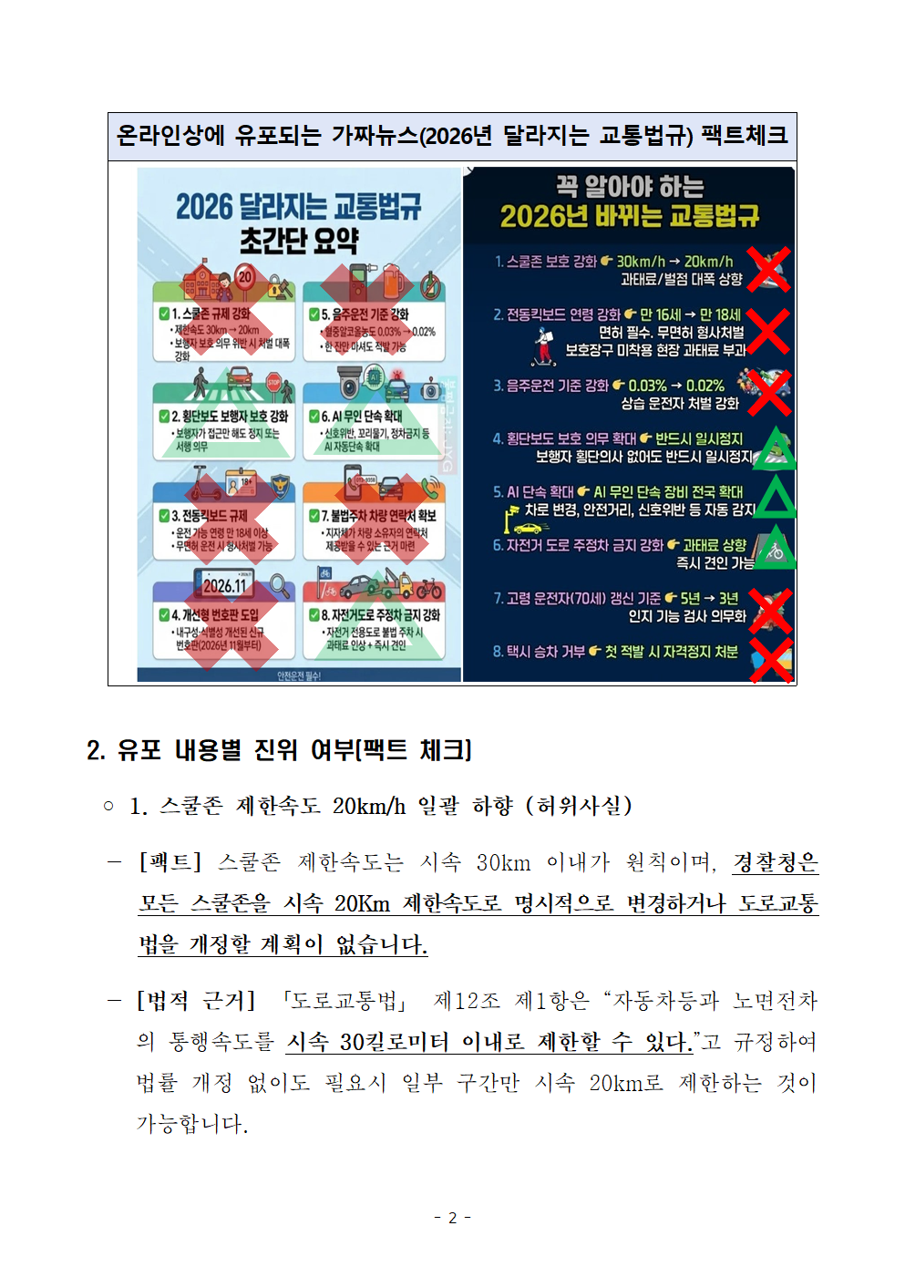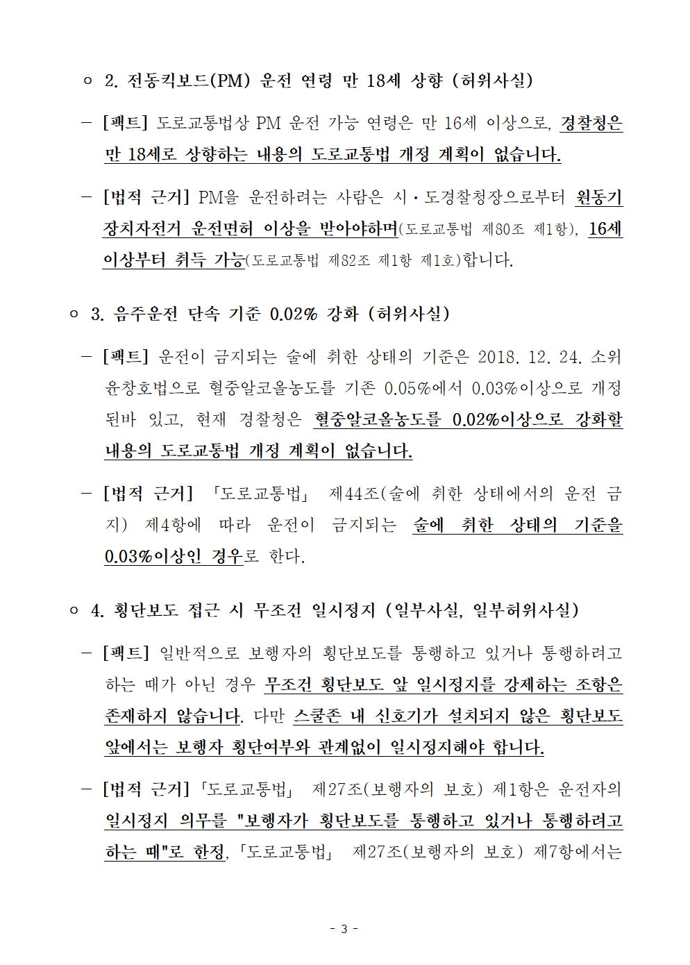 경찰청은 국민을 혼란시키는 '교통법규 괴담' 관련, 정확한 정보를 제공하여 국민 불안을 해소하겠습니다.