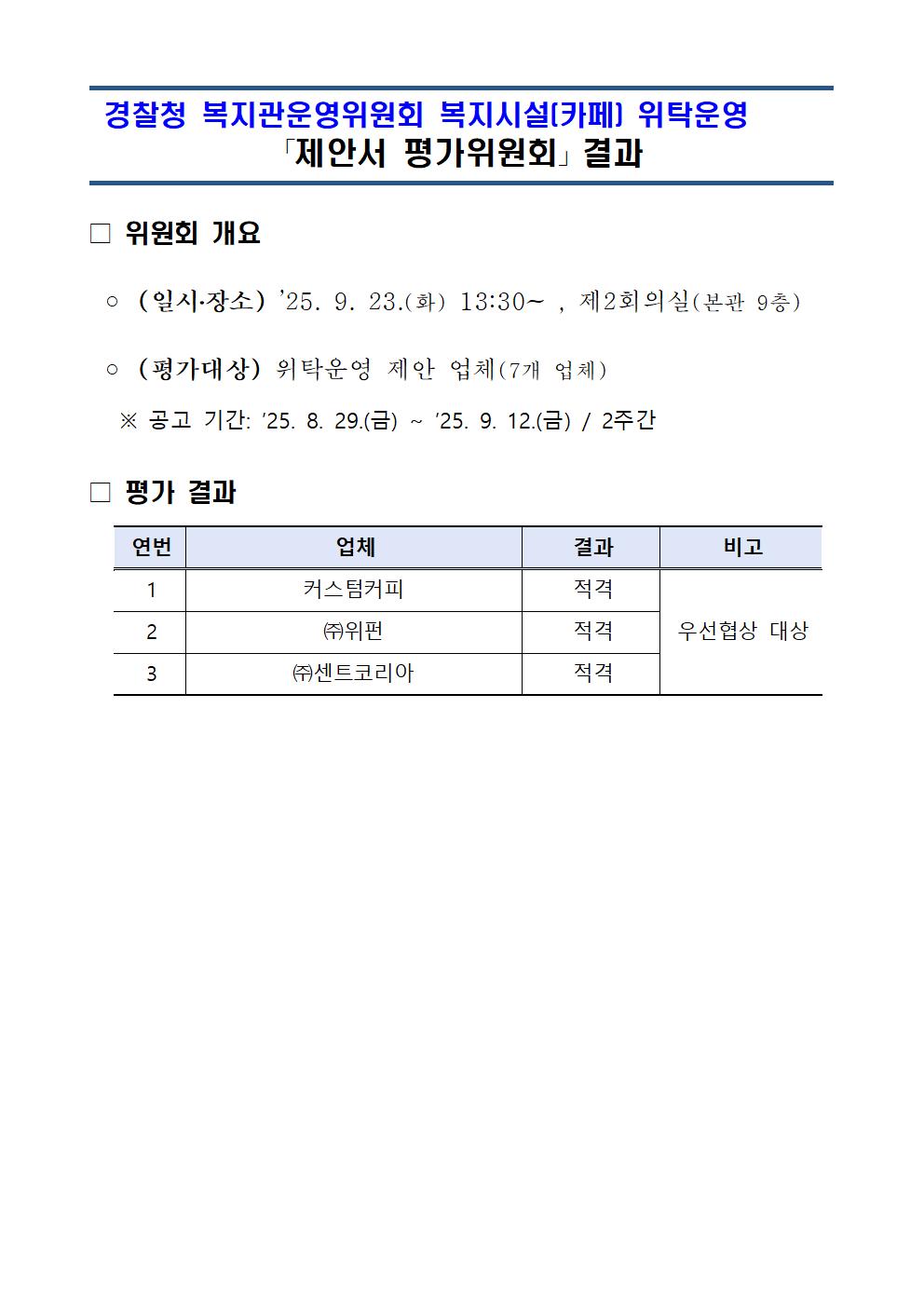 제안서(규격) 평가 결과 공고 - 경찰청 복지시설(카페) 위탁업체 모집