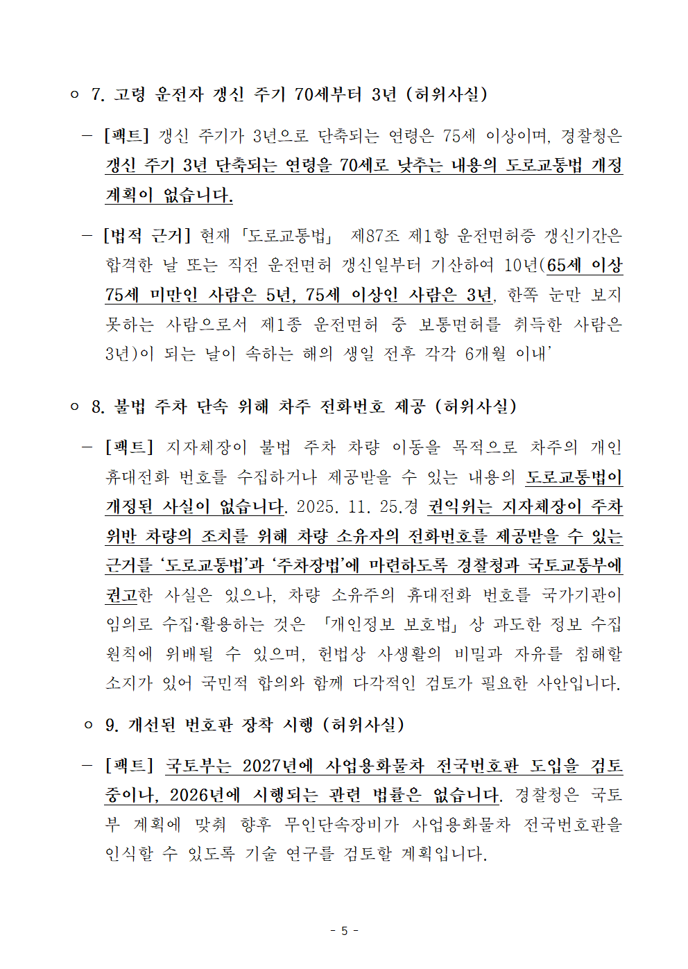 경찰청은 국민을 혼란시키는 '교통법규 괴담' 관련, 정확한 정보를 제공하여 국민 불안을 해소하겠습니다.